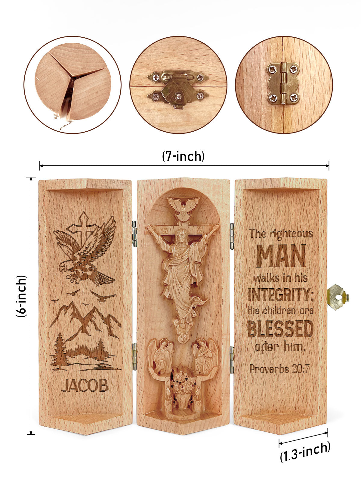 This intricately crafted wooden sculpture is a heartfelt tribute to faith and family. The product features a beautifully designed cylindrical wooden container that opens to reveal a 3D depiction of Jesus Christ on the cross, surrounded by angels and a dove symbolizing the Holy Spirit.
