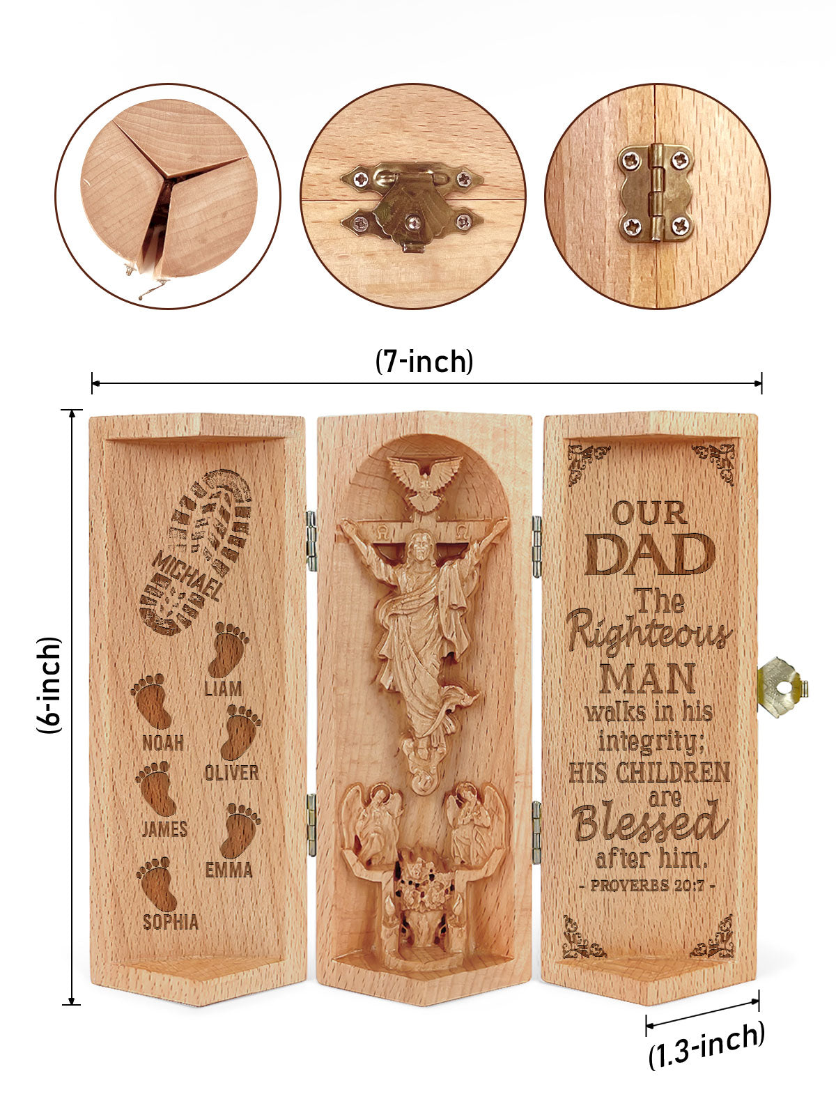 This intricately crafted wooden sculpture is a heartfelt tribute to faith and family. The product features a beautifully designed cylindrical wooden container that opens to reveal a 3D depiction of Jesus Christ on the cross, surrounded by angels and a dove symbolizing the Holy Spirit.