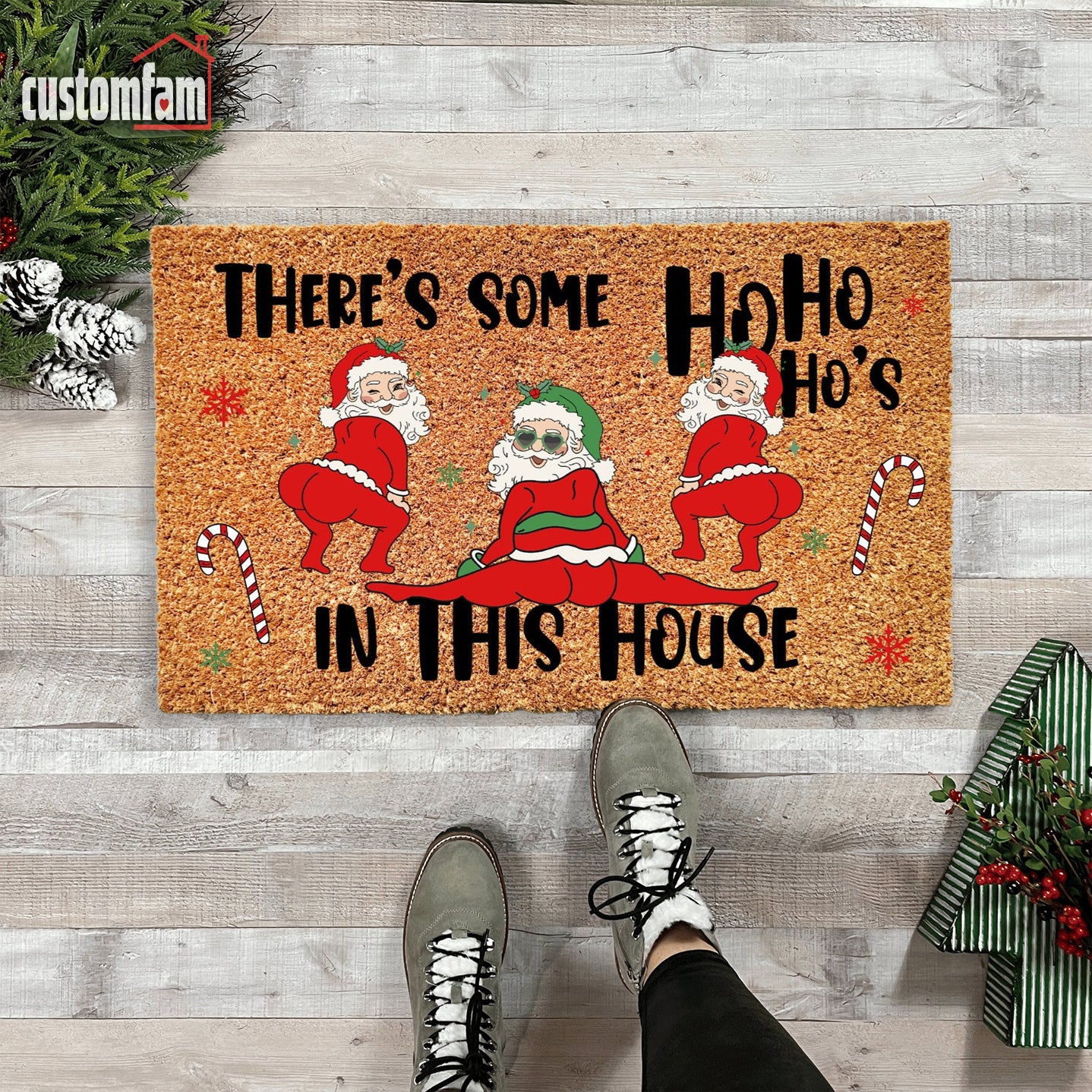 - Color Scheme: The background is a neutral tone, with bright reds, whites, and greens highlighting Santa’s twerking figure and Christmas accents, making the doormat stand out.