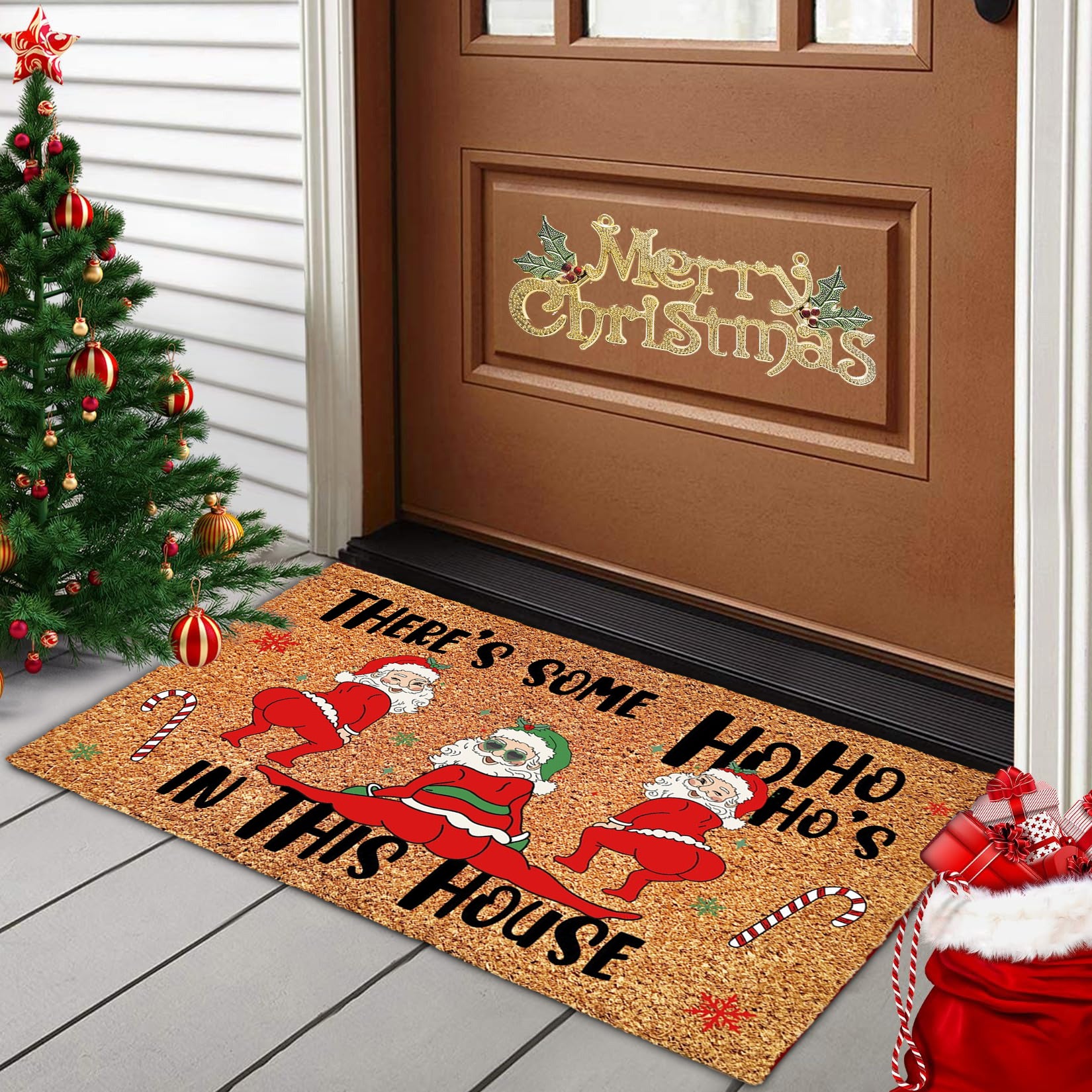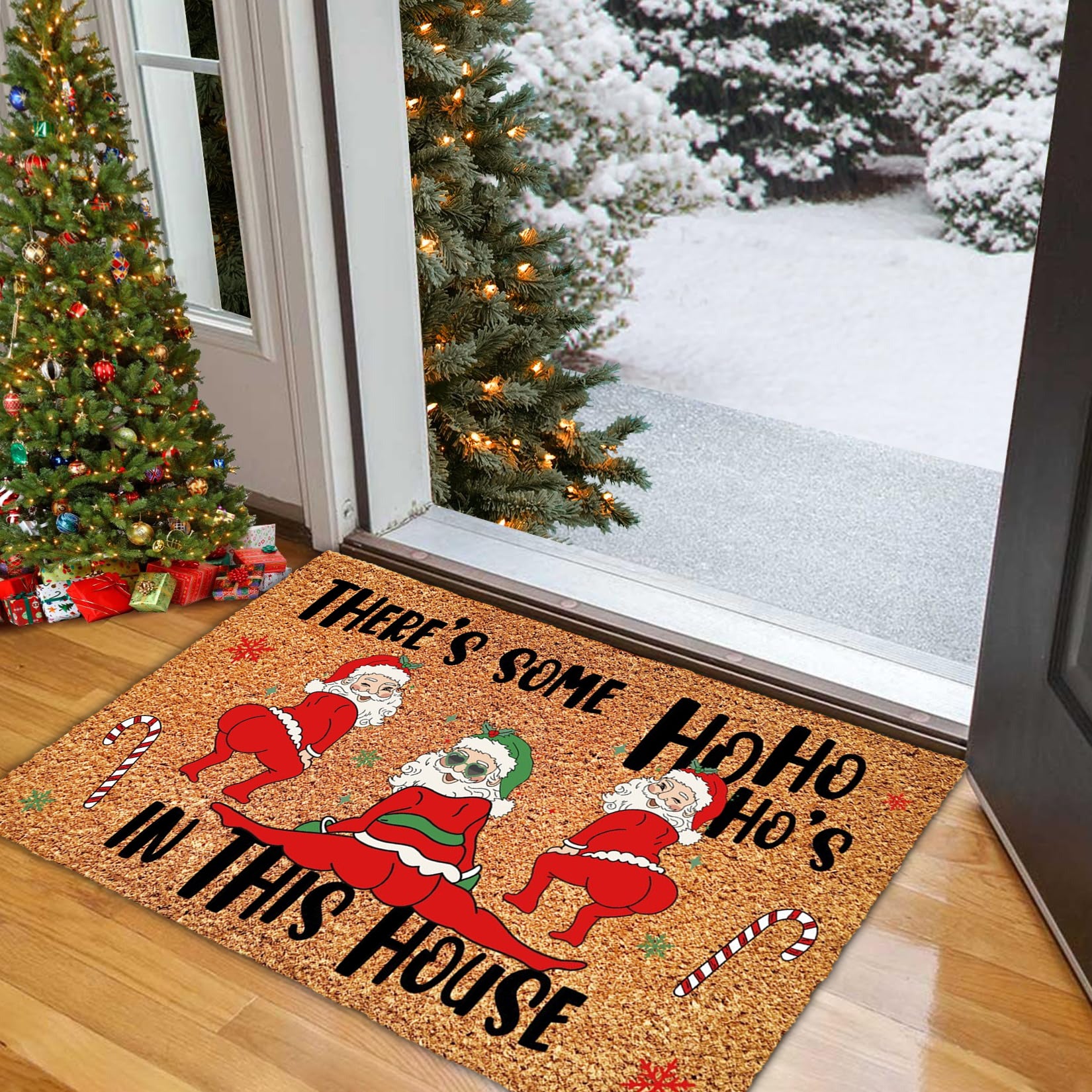 - Design: The doormat showcases a dancing or twerking Santa with the phrase "There's Some Ho Ho Ho's In This House", making it an instant conversation starter and adding a quirky festive touch to your doorstep.