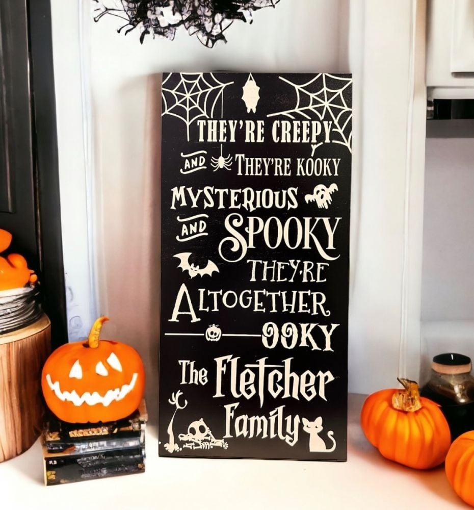 The sign is wooden and is printed in black and white with a popular Halloween Jingle on the front. You can personalise this sign but adding your family name at the bottom.