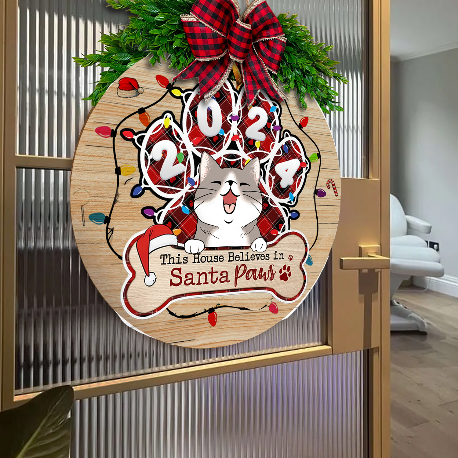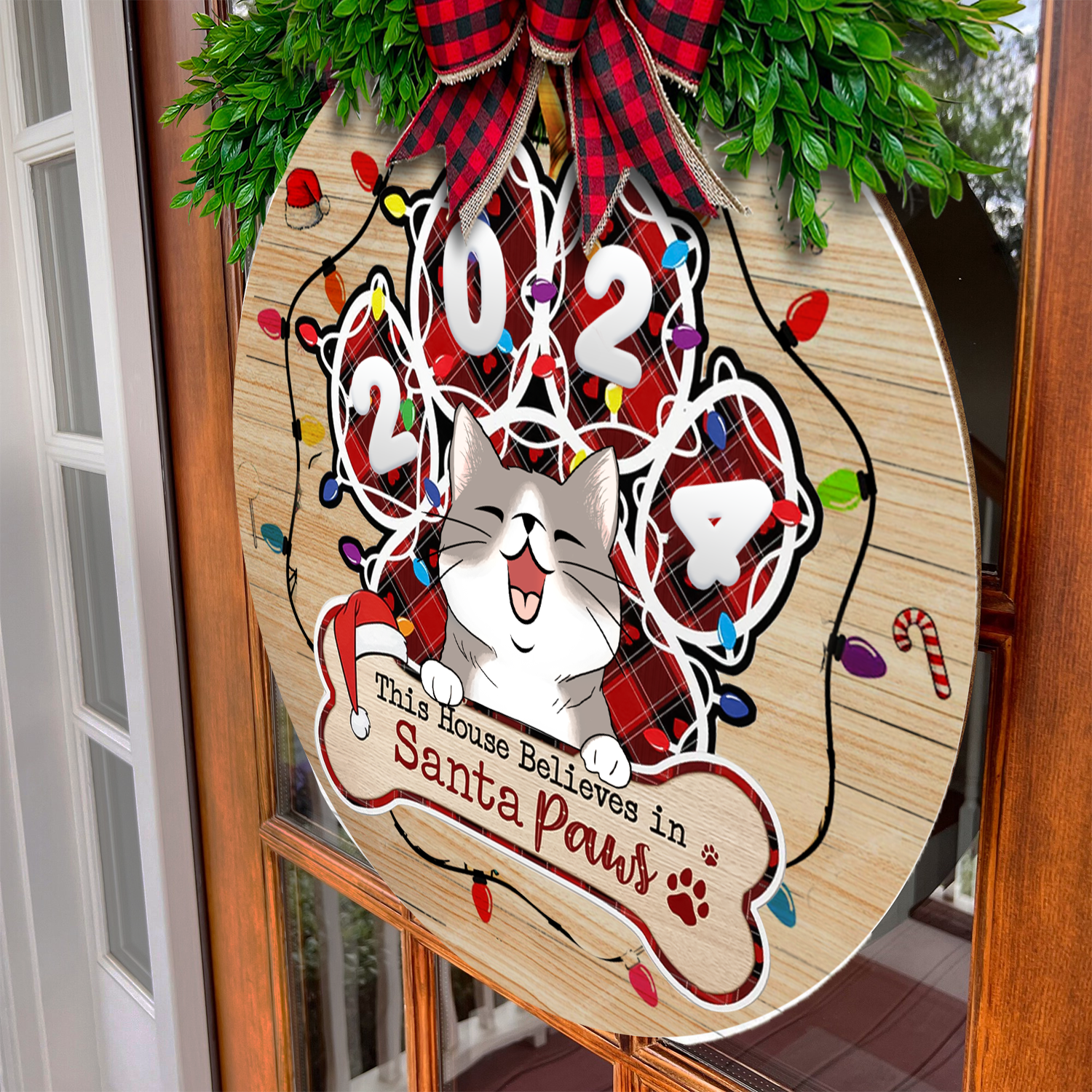 Handcrafted from high-quality wood, this sign features adorable cat-themed designs alongside the festive message “This House Believes In Santa Paws.” Personalize it with your cat’s name or a family greeting, making it a one-of-a-kind decoration that brings warmth and joy to your holiday celebrations.