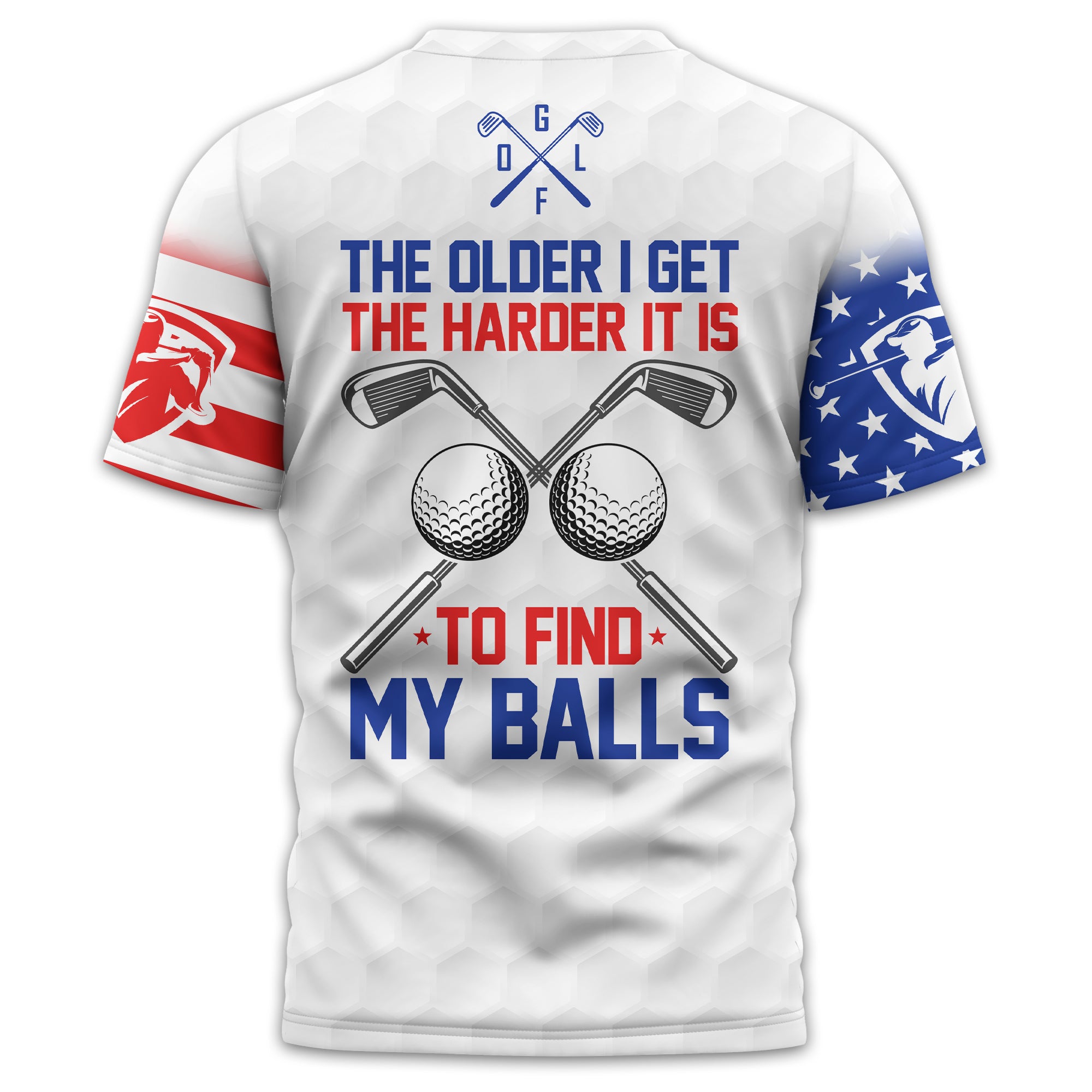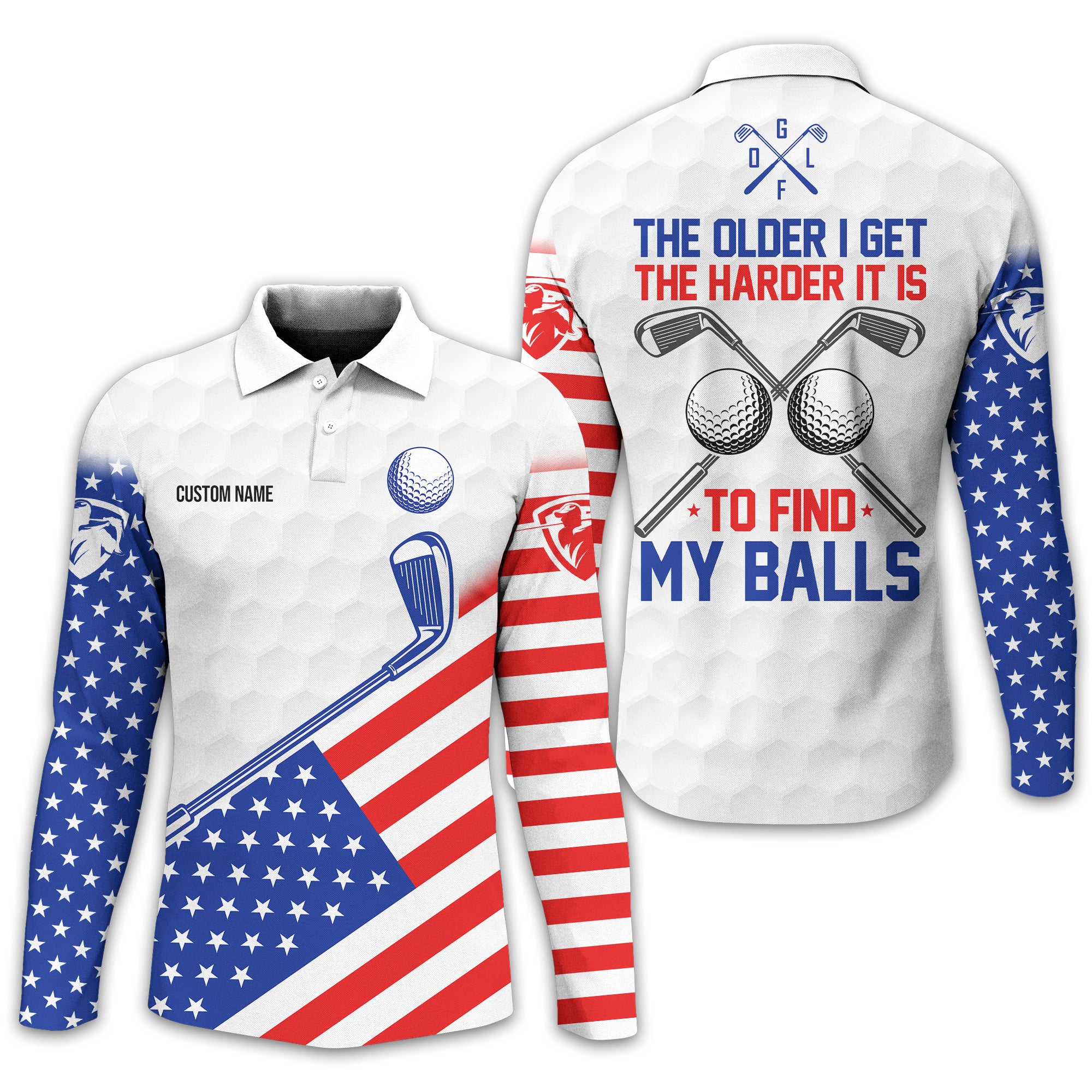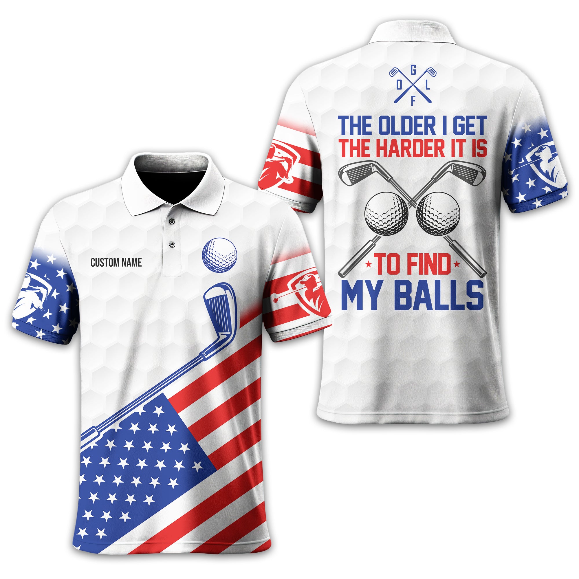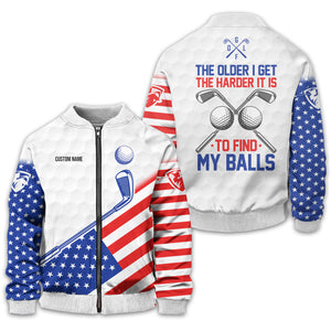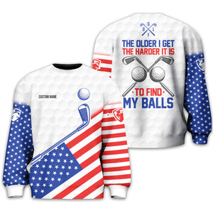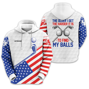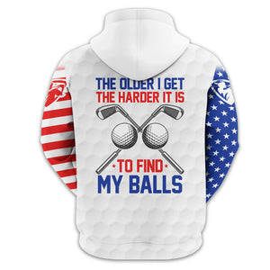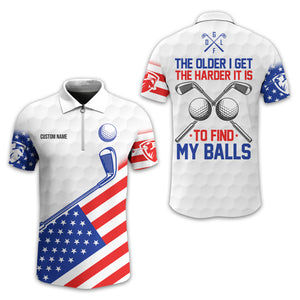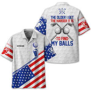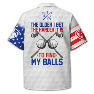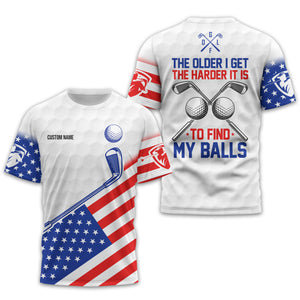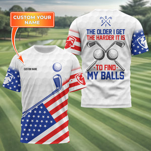 Show off your sense of humour and patriotic spirit on the green with this unique and personalized golf shirt! Designed with golfers in mind, this shirt combines a playful message, "The Older I Get, The Harder It Is to Find My Balls," with a bold USA flag design. It's the perfect blend of style, comfort, and personality for your next golf outing.