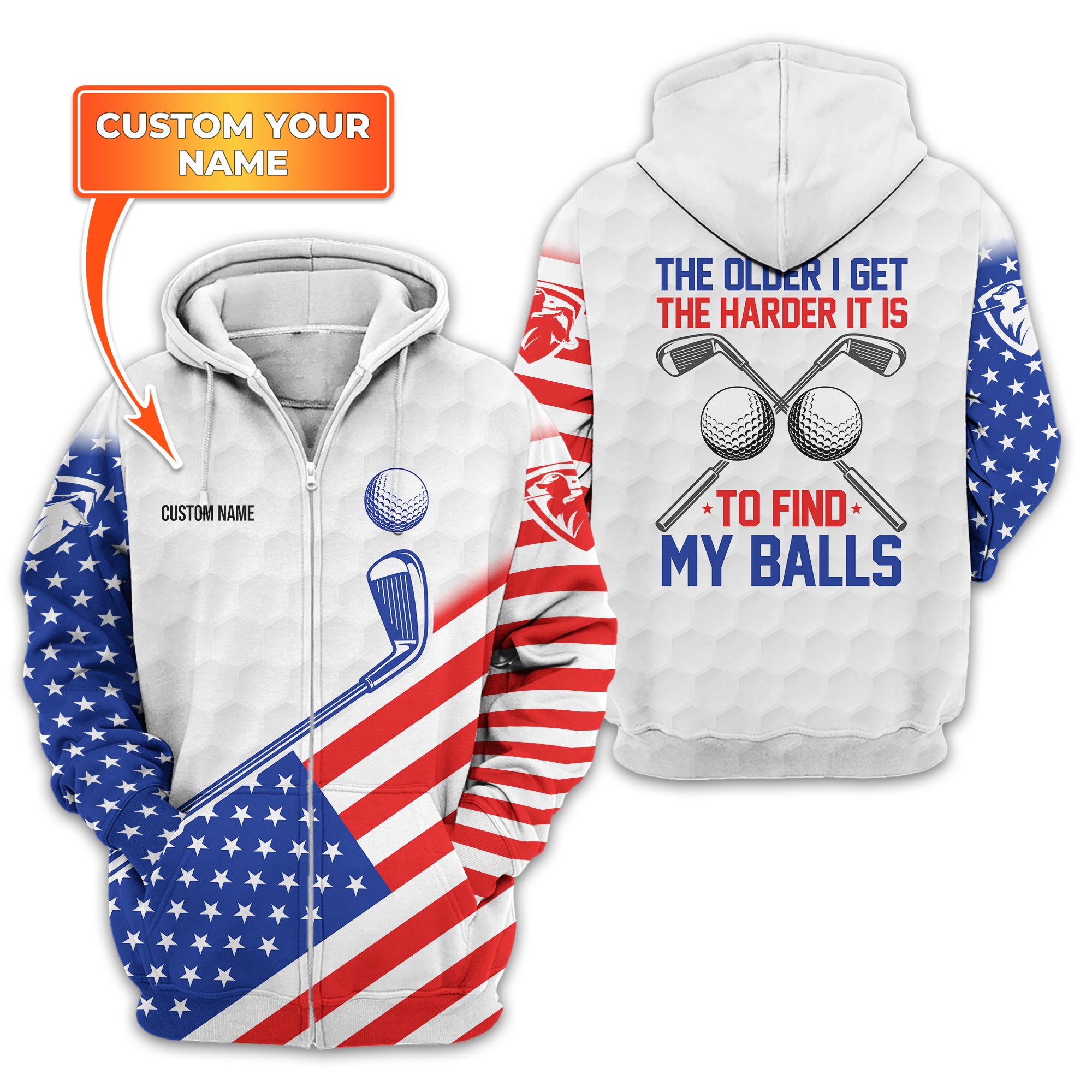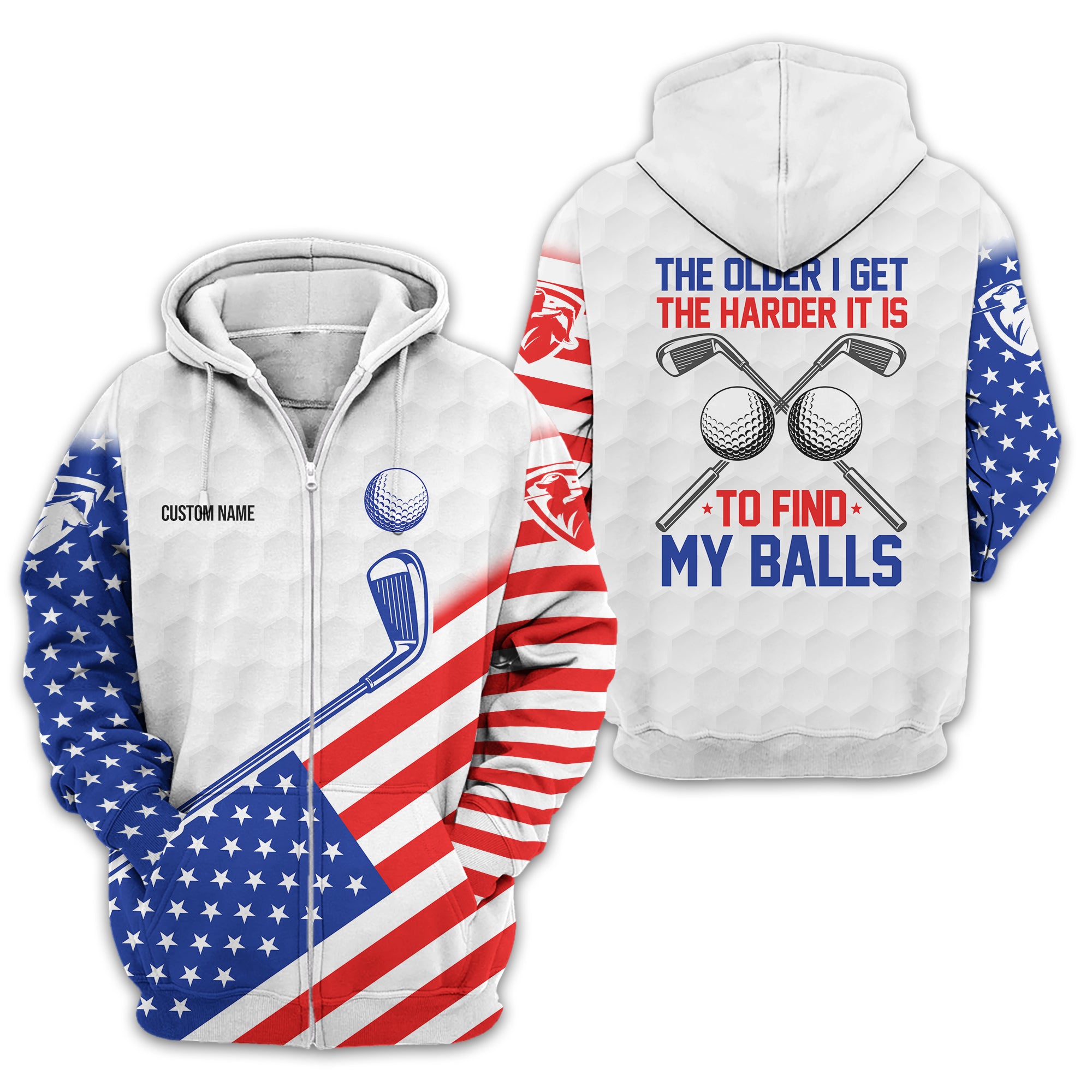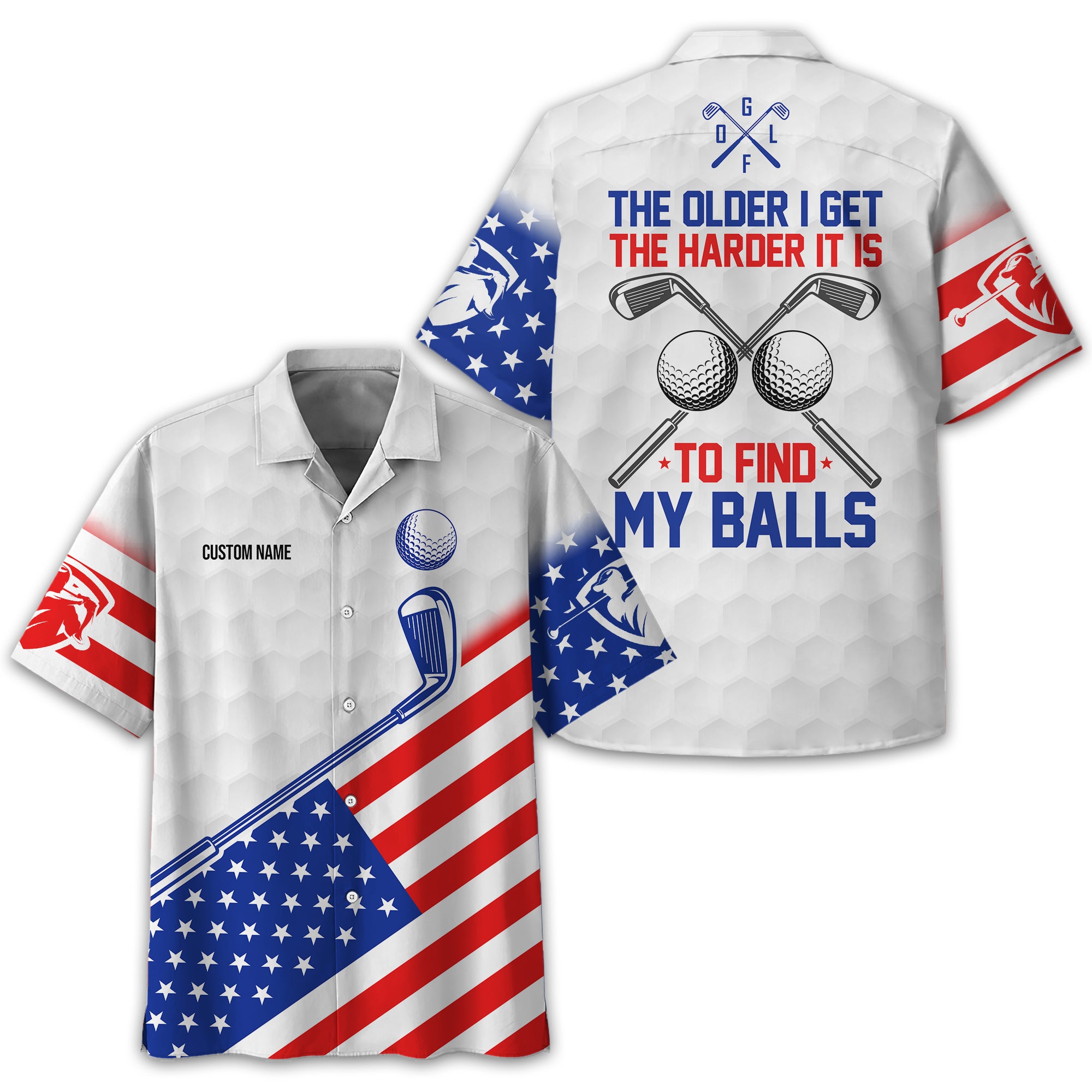 Show off your sense of humour and patriotic spirit on the green with this unique and personalized golf shirt! Designed with golfers in mind, this shirt combines a playful message, "The Older I Get, The Harder It Is to Find My Balls," with a bold USA flag design. It's the perfect blend of style, comfort, and personality for your next golf outing.