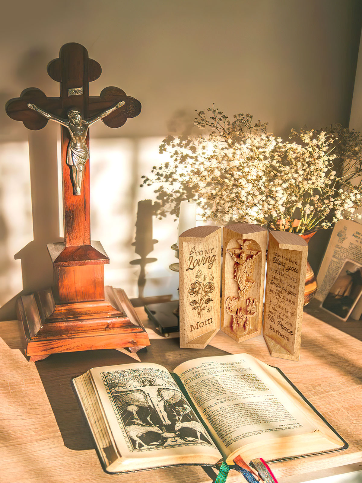 This intricately crafted wooden sculpture is a heartfelt tribute to faith and family. The product features a beautifully designed cylindrical wooden container that opens to reveal a 3D depiction of Jesus Christ on the cross, surrounded by angels and a dove symbolizing the Holy Spirit.