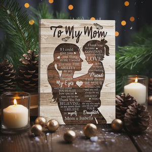 Surprise your mom with a gift that speaks straight from the heart! Our "To My Mom" Personalized Canvas Print is a touching tribute to the love, support, and strength of a mother. Featuring a beautiful silhouette of a mother and daughter, this high-quality wooden-style canvas is designed to be a cherished keepsake for years to come.