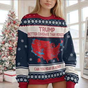 "Better Coverage Than Verizon" – a sweater as bold as the season! This funny political shirt combines holiday cheer with a playful nod to the Trump 2024 campaign. Perfect for ugly sweater parties, holiday gatherings, or anyone who loves a good laugh with a political twist.
