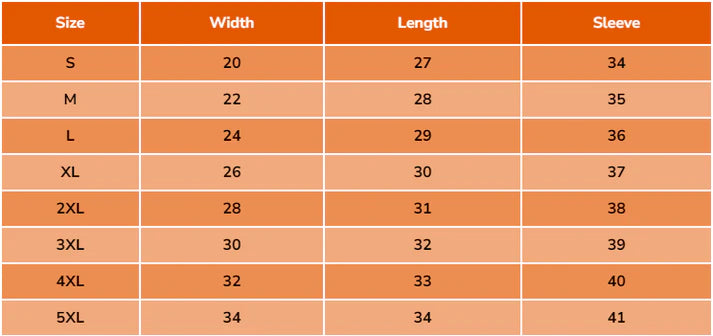 | Size | Chest (Front Only) | Body Length | Sleeve Length |
