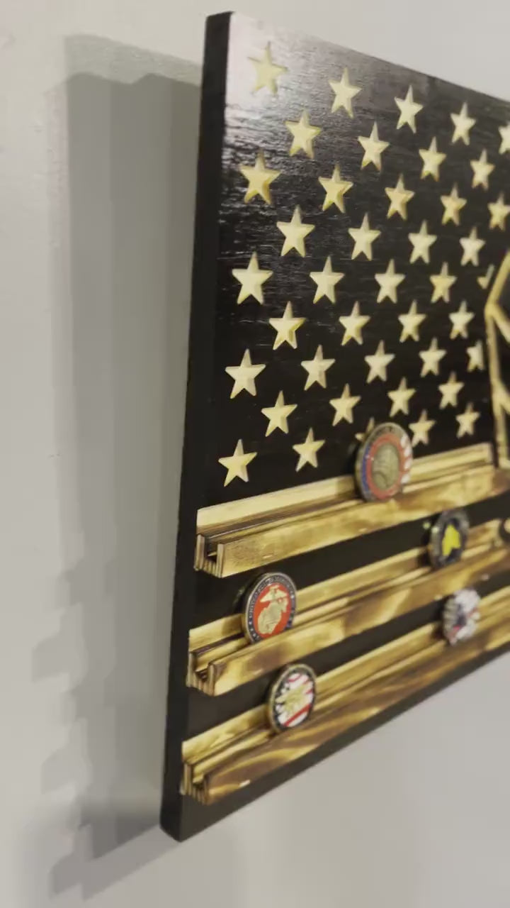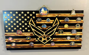 United States Air Force (USAF) Coin Holder Display Flag. The flag is made of pine wood, are available in three sizes and has 6 rows of coin holders. The flag is lacquered with multiple coats for a beautiful shiny finish. This is a beautiful way to display your coin collection. Wall hanging hardware is included.