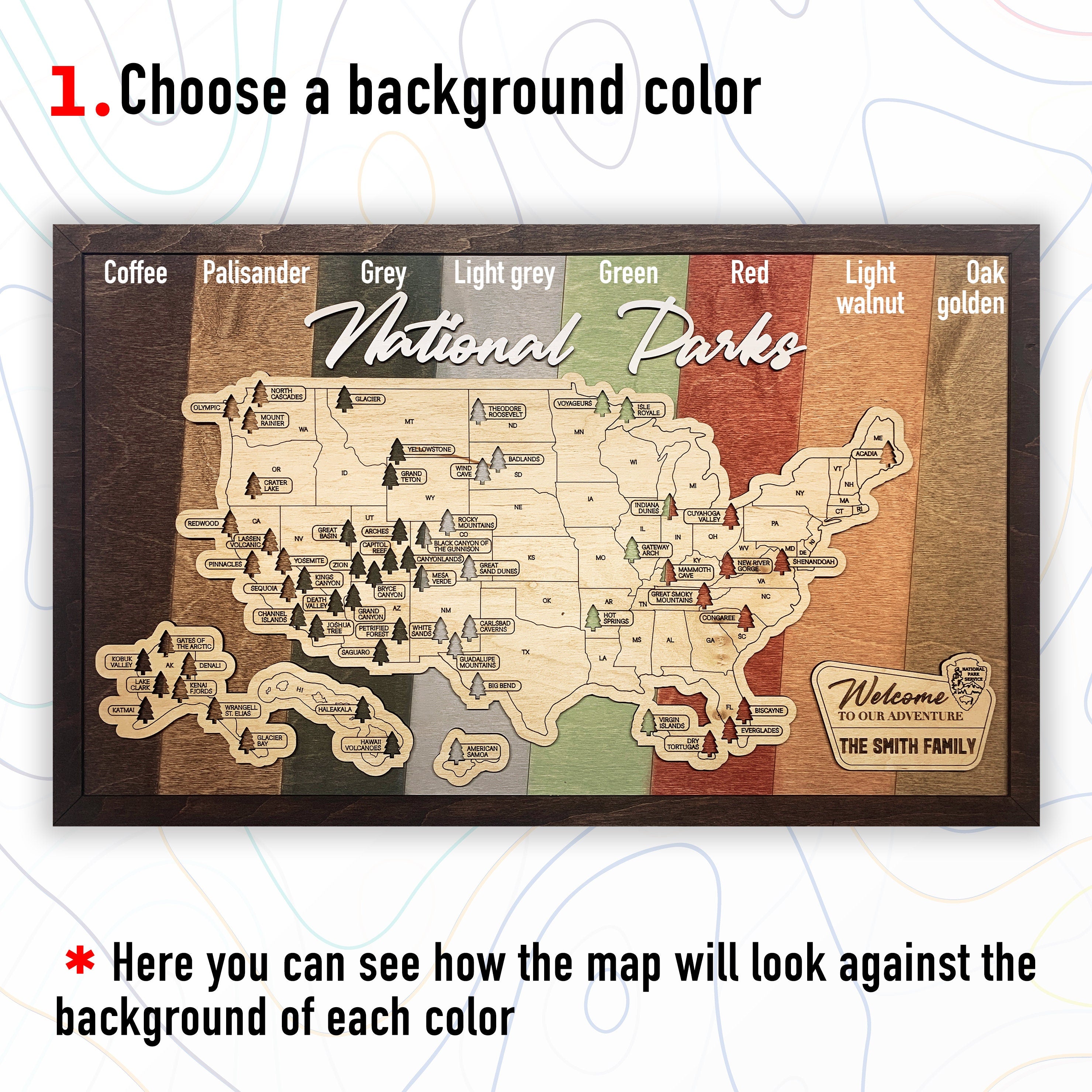 With our custom engraved badge, your wood map becomes a one-of-a-kind storyteller - marking your family name and the beginning of countless outdoor journeys through America's most beautiful parks.