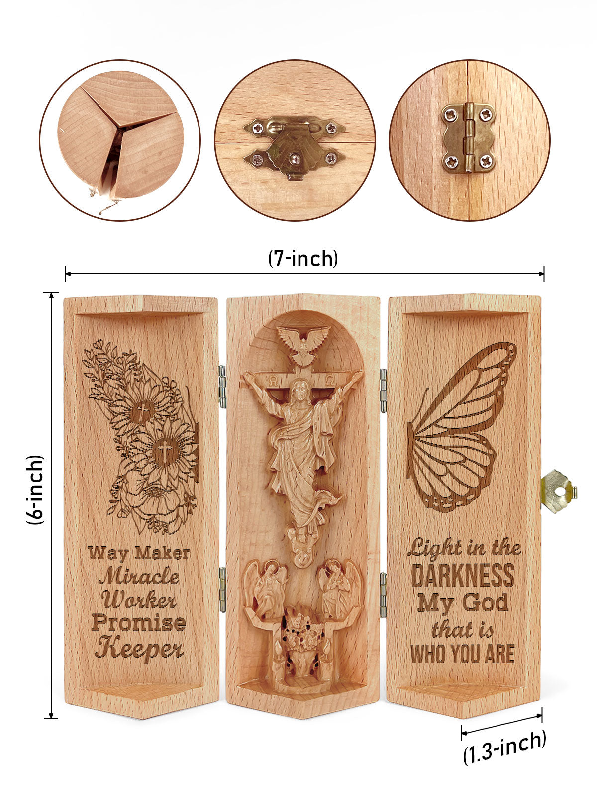 This intricately crafted wooden sculpture is a heartfelt tribute to faith and family. The product features a beautifully designed cylindrical wooden container that opens to reveal a 3D depiction of Jesus Christ on the cross, surrounded by angels and a dove symbolizing the Holy Spirit.
