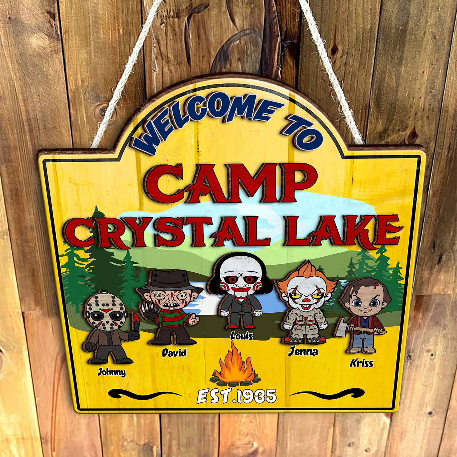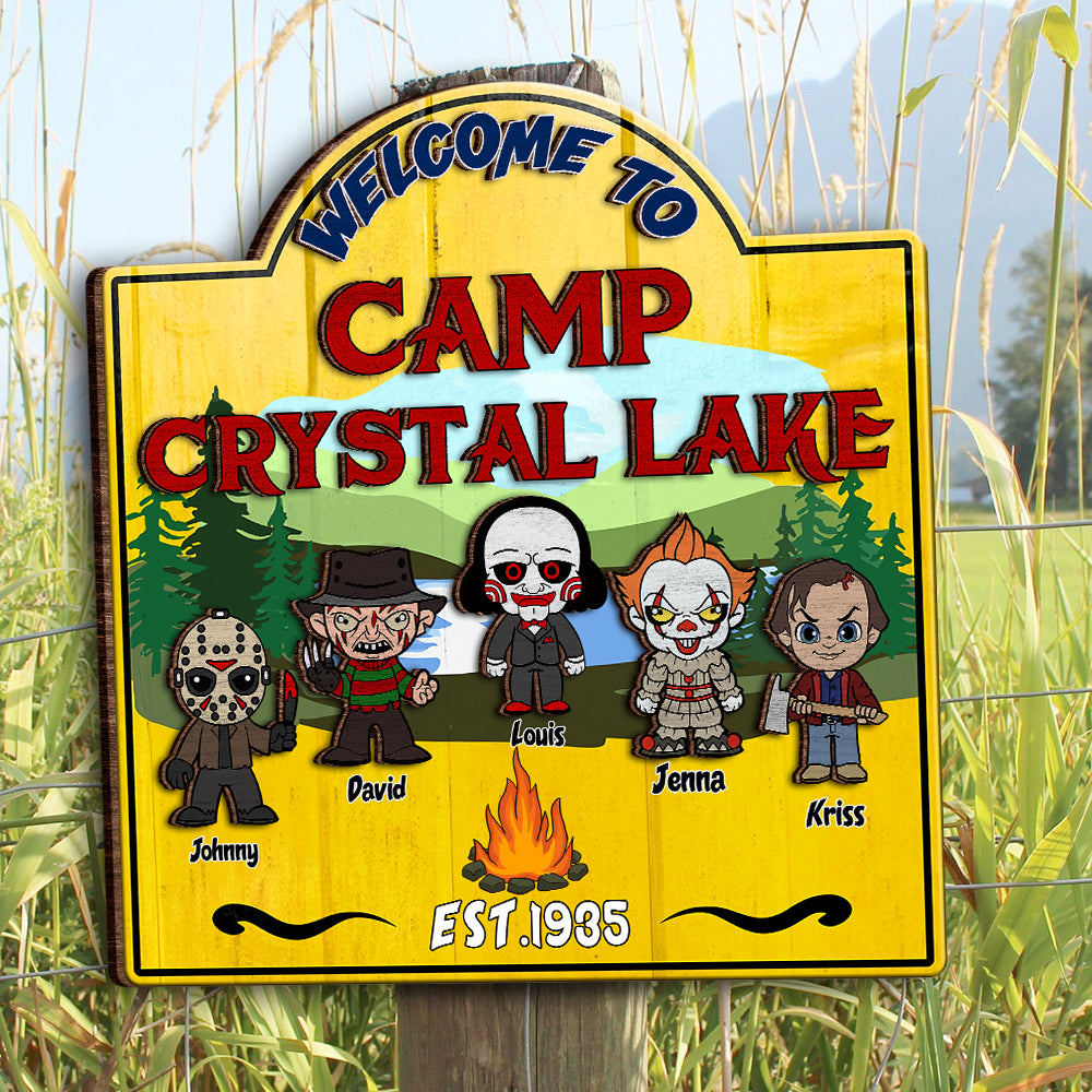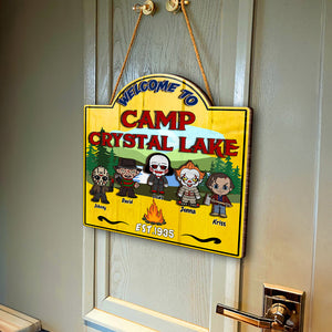 Welcome To Camp Crystal Lake Horror Camping Wooden Sign, Halloween Custom Welcome Campsite Sign Decor
