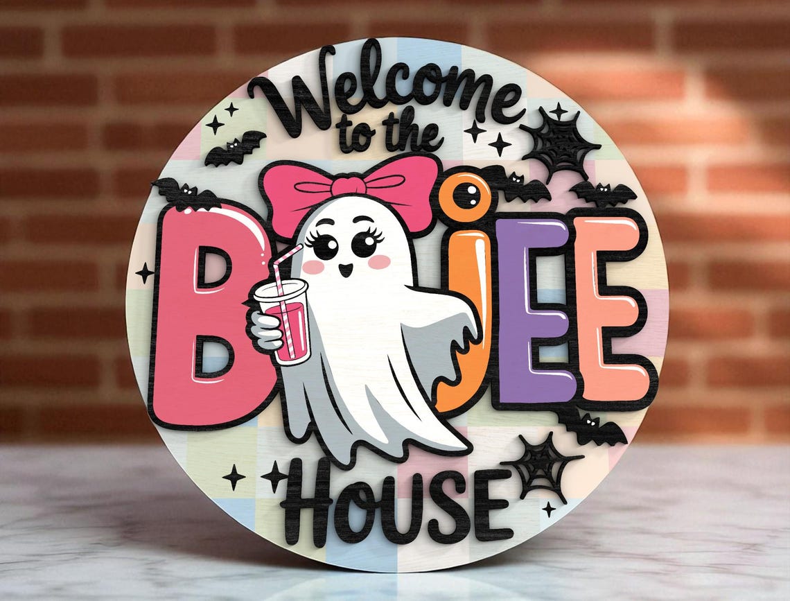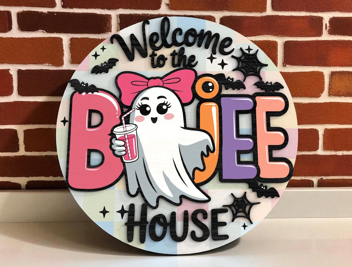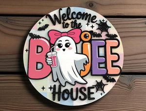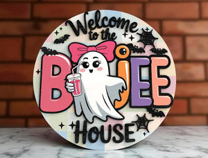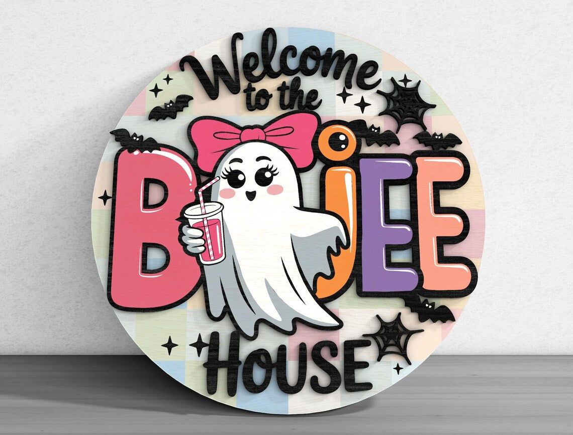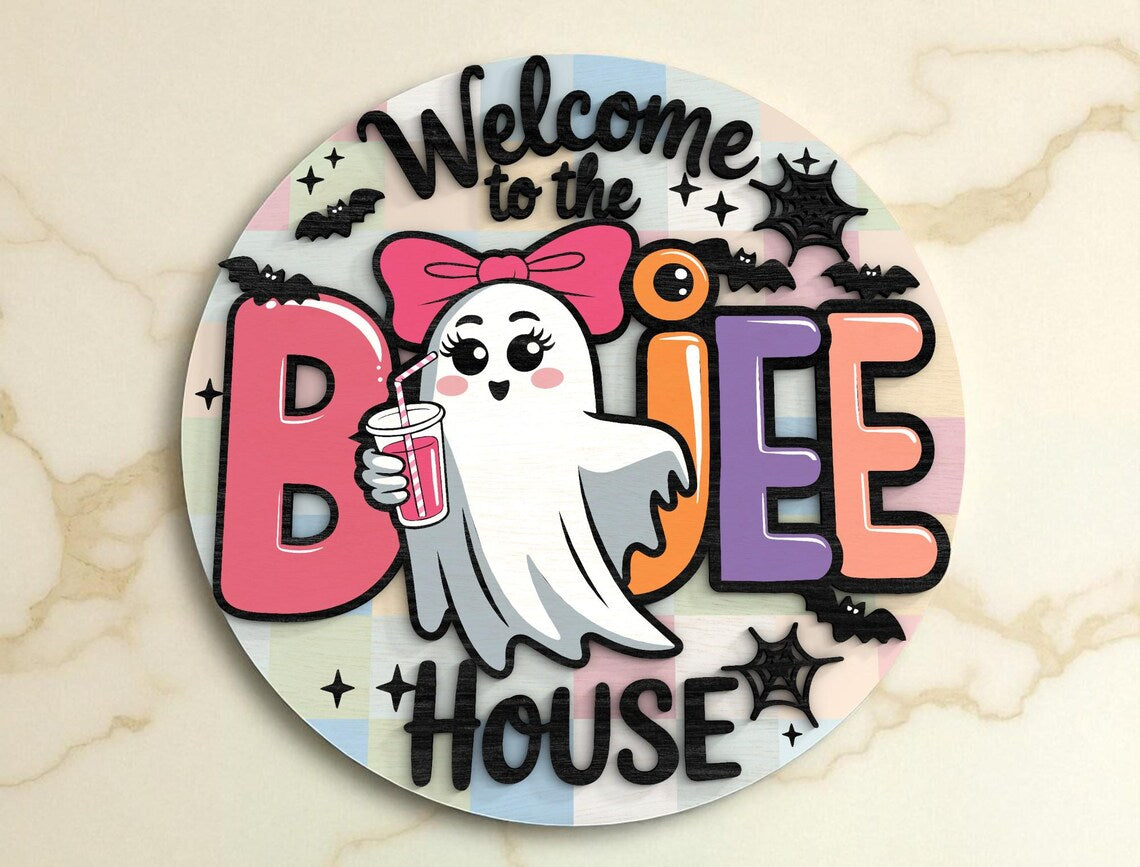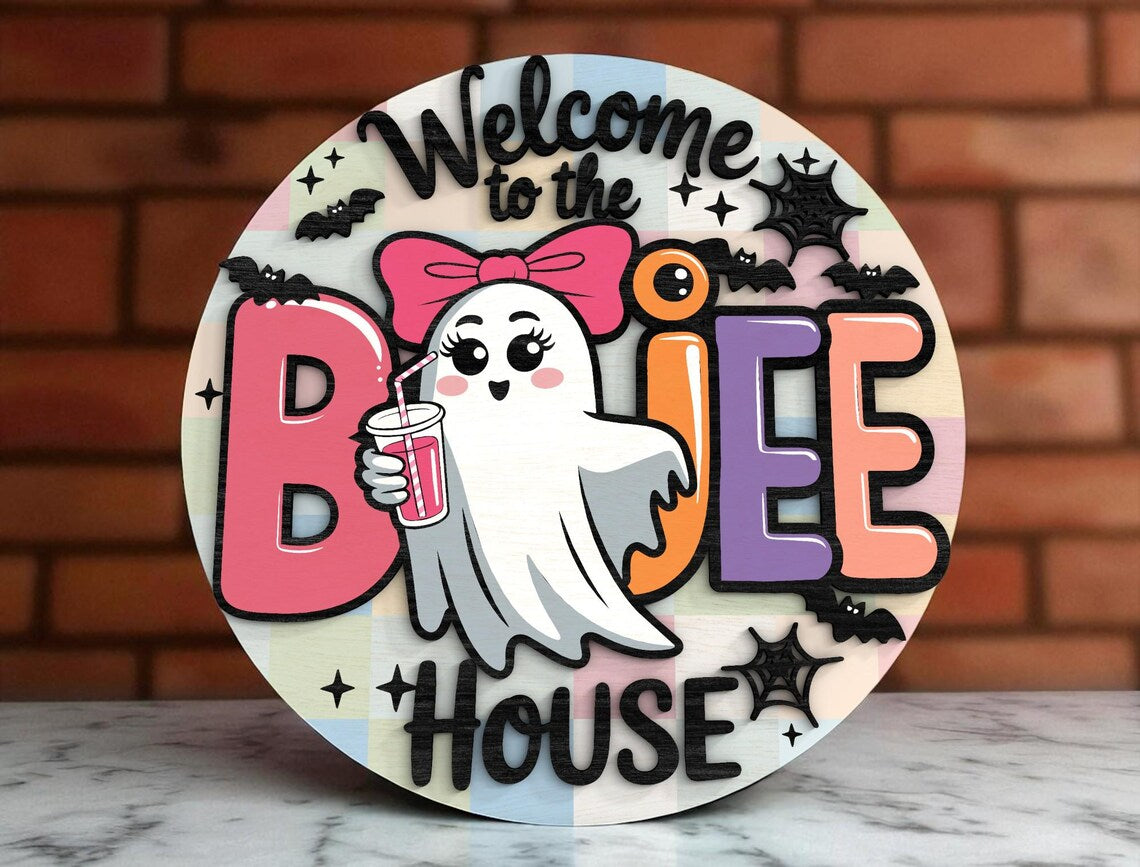 Bring the eerie spirit of Halloween into your home with our Welcome To The Boujee House Cute Ghost Halloween Halloween Door Hanger. Each piece is meticulously crafted from premium wood, featuring 2-layer laser-cut designs that add depth and texture to your decor. Whether you're celebrating the spooky season or adding a year-round touch of fright, these signs are the perfect choice.