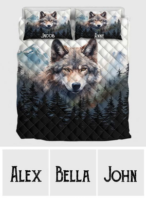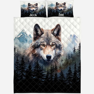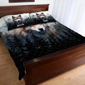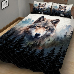 Embrace the wild beauty of love with our Wolf in Forest Wolf Couple Quilt Bed Set. This stunning bedding set features a captivating design of a wolf couple amidst a serene forest backdrop, symbolizing unity, loyalty, and the untamed spirit of nature.