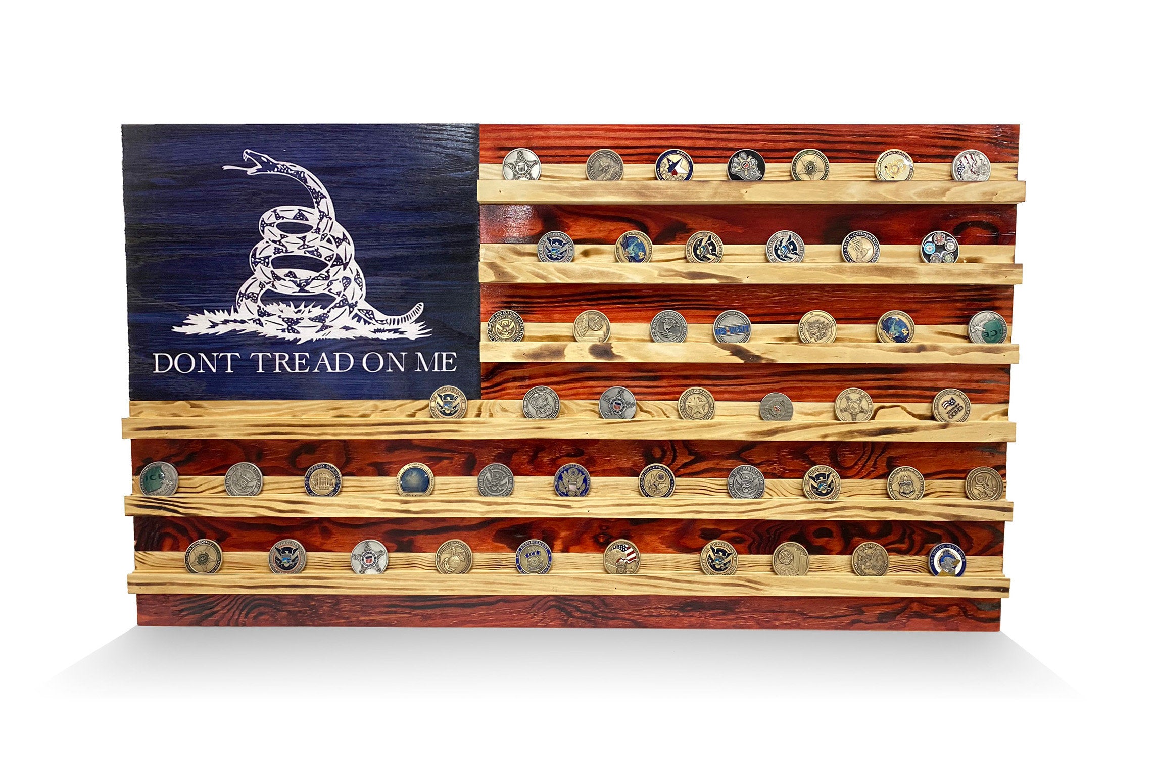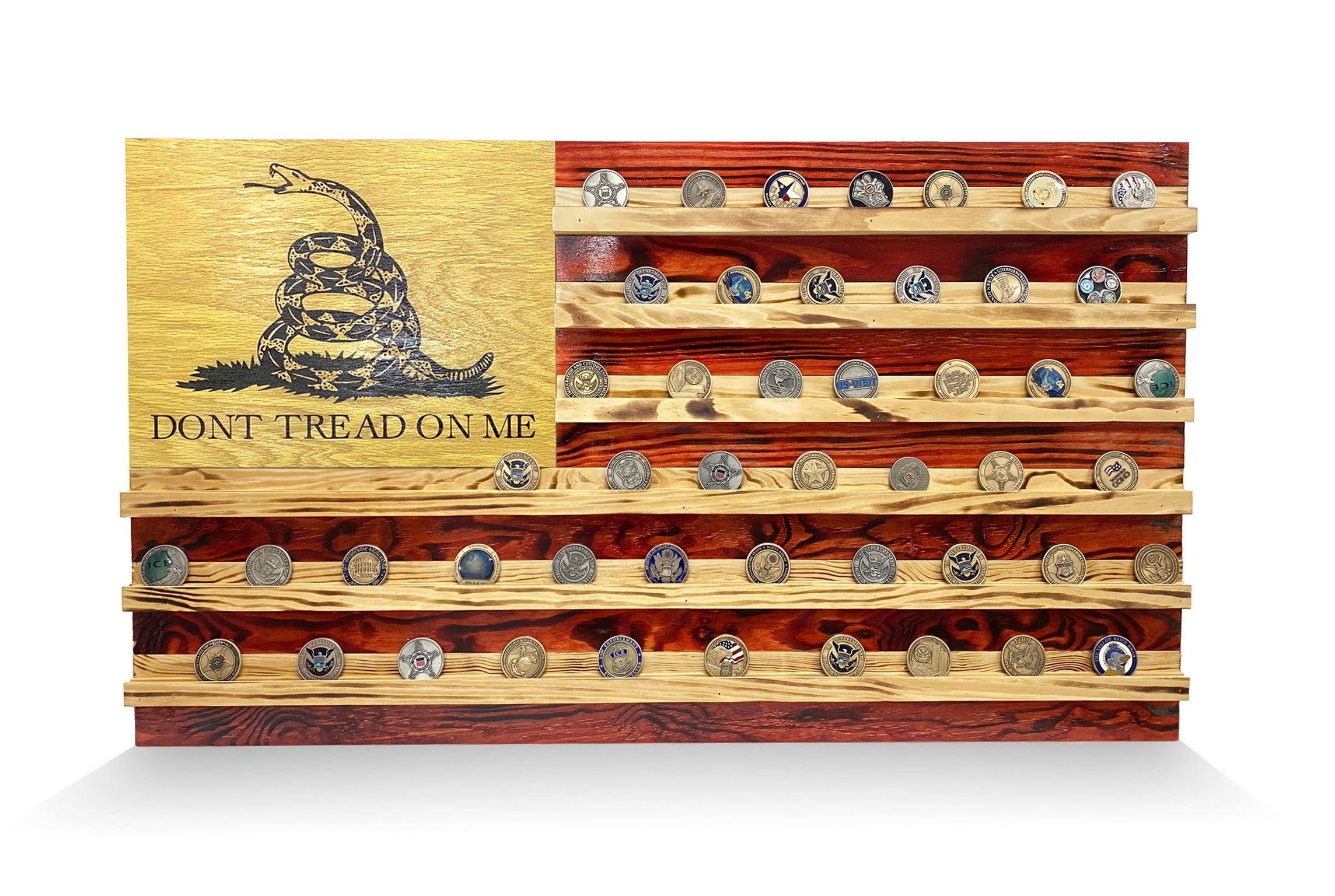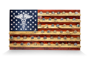 Show off your collection and your patriotic pride with an American Flag Challenge Coin Display Wall Rack. This hand finished, hanging coin display is a great gift for the collector, veteran or service member in your life. We use 100% repurposed pine, oak, and birch plywood that is hand selected for character and quality. Each piece is hand painted and flame polished to highlight the natural wood grain pattern.