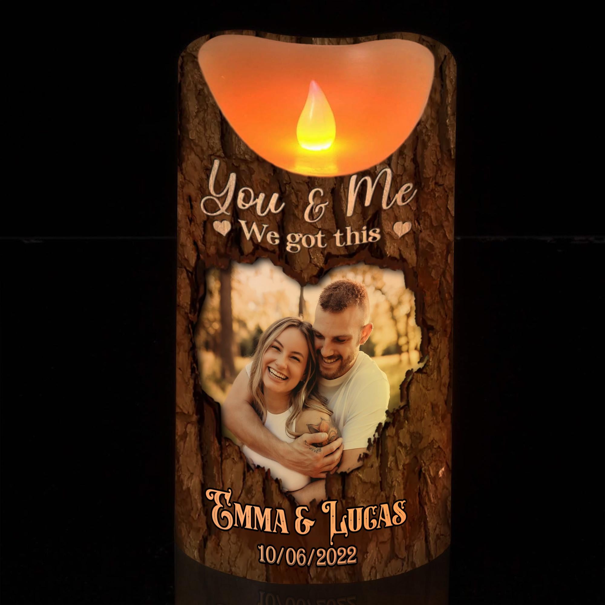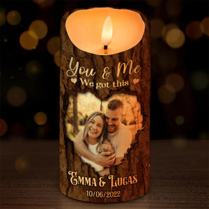 Celebrate your love with our Custom Couple Wedding Anniversary LED Light Candle. Featuring the heartfelt quote "You And Me, We Got This," this candle is the perfect romantic gift for your husband or wife. Ideal for anniversaries, weddings, or Christmas, it adds a warm, personalized touch to your home decor. Surprise your partner or a special couple in your life with this unique and thoughtful keepsake that lights up their love story.