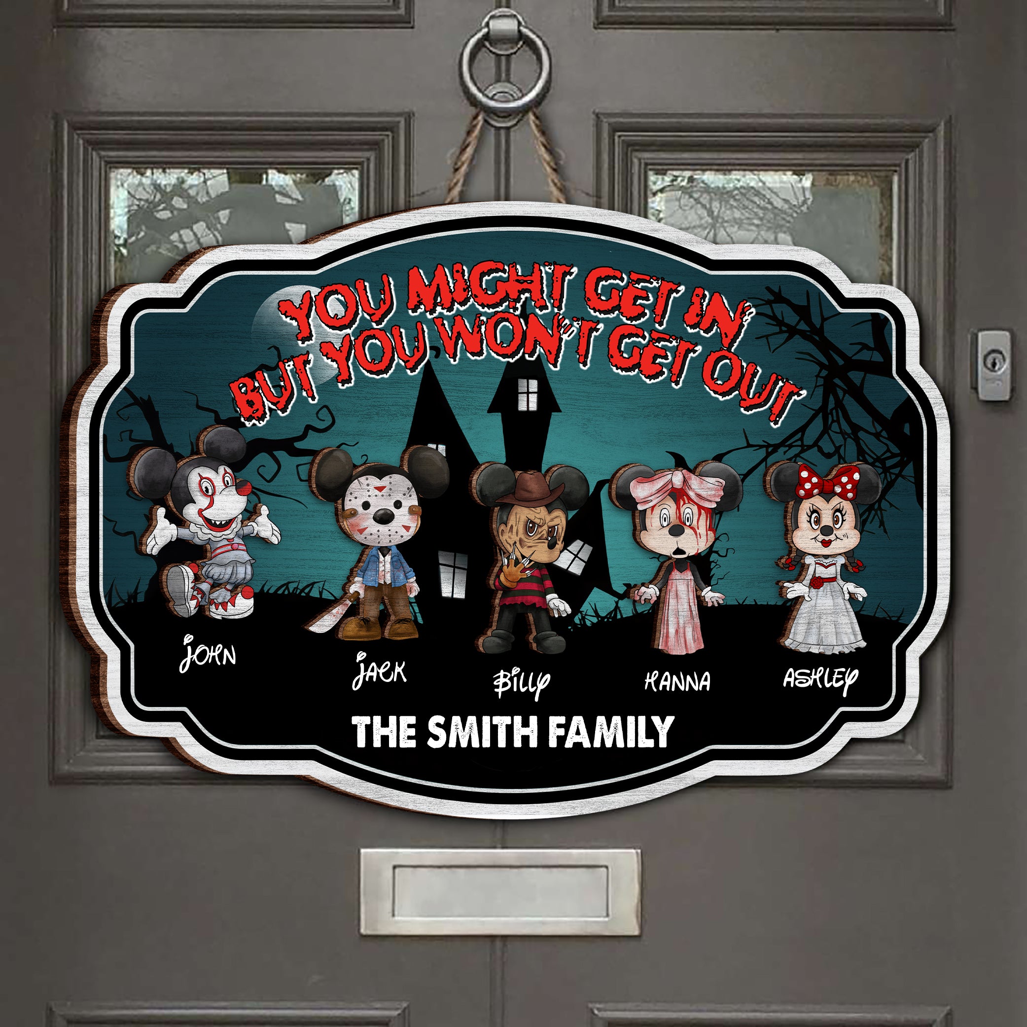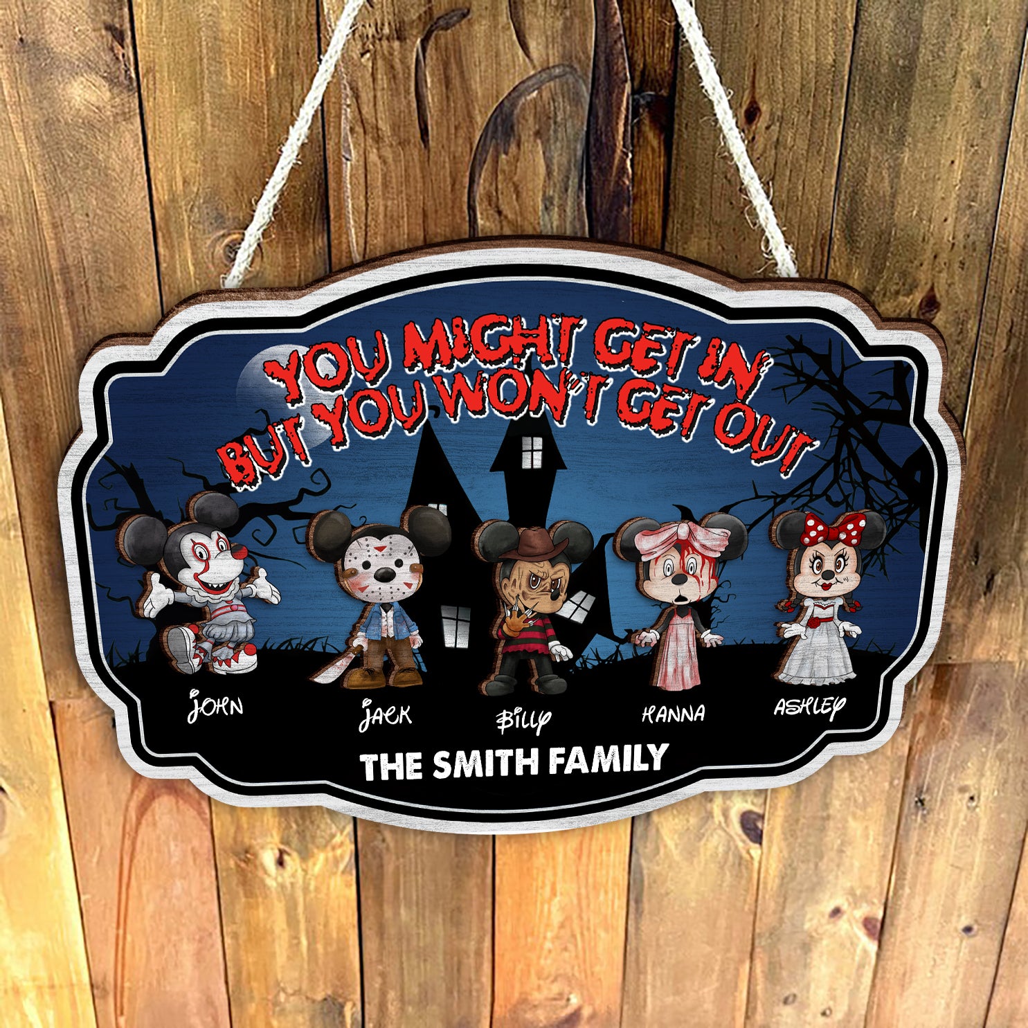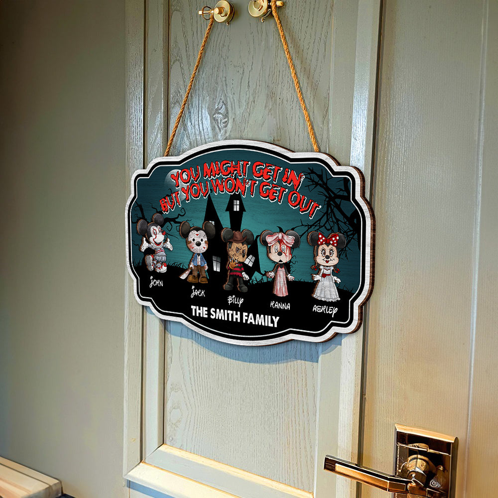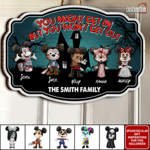 You Might Get In But You Won't Get Out Personalized 2 Layered Family Halloween Wood Sign, Horror Gift