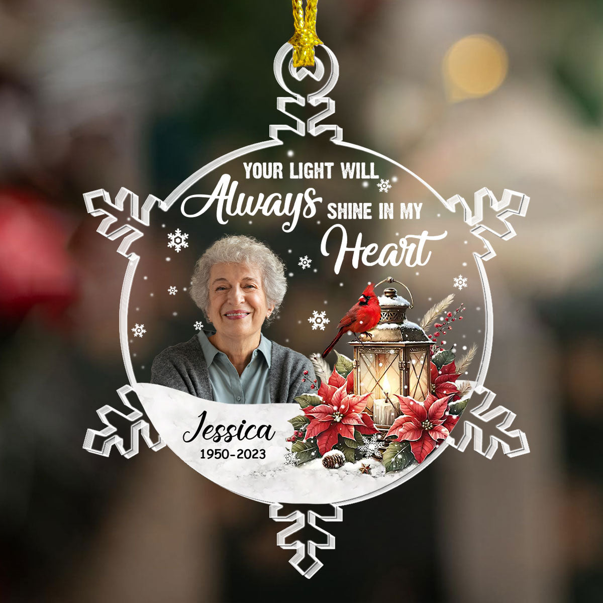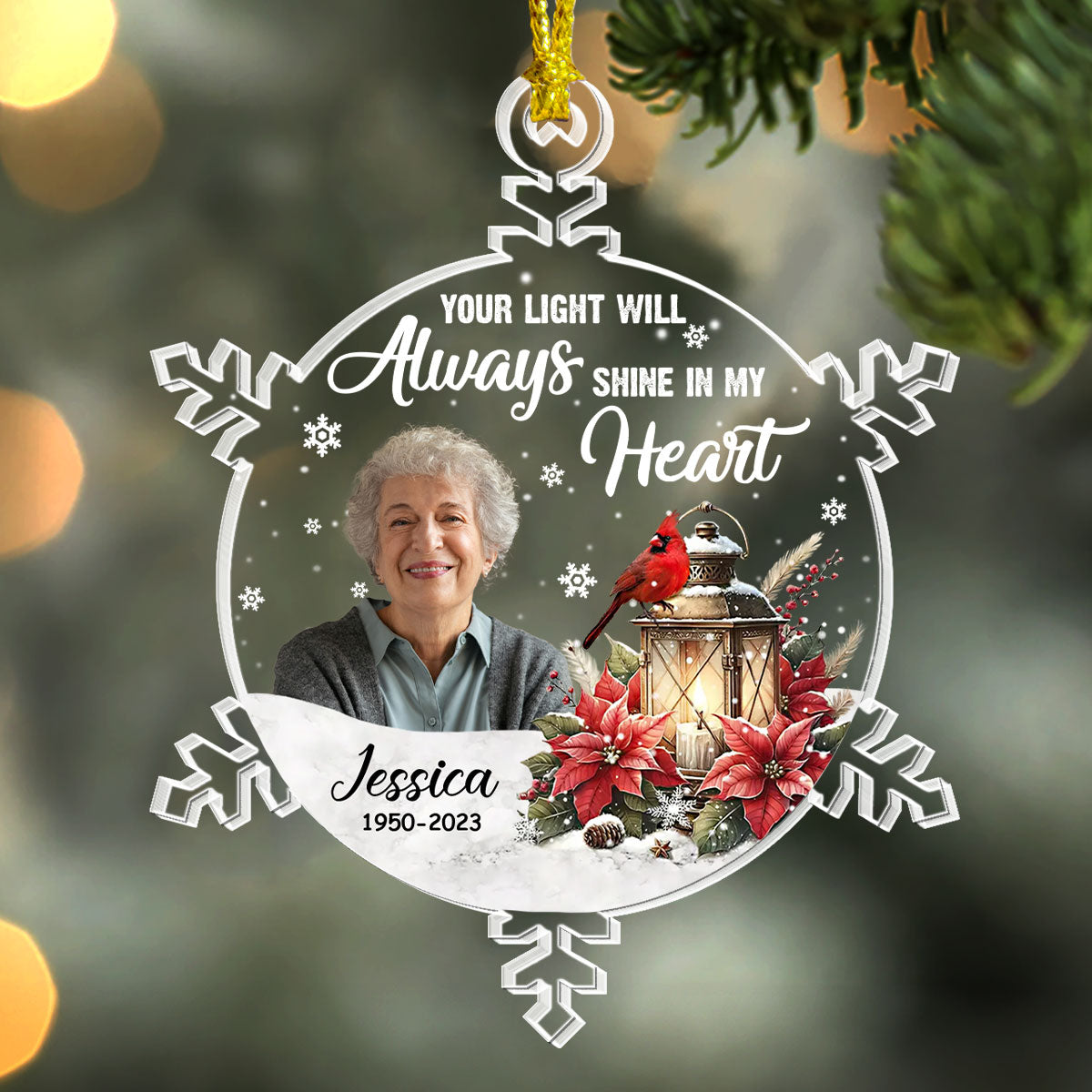 Your Light Will Always Shine In My Heart Acrylic Ornament, Custom Photo Ornament, Christmas Memorial Ornament