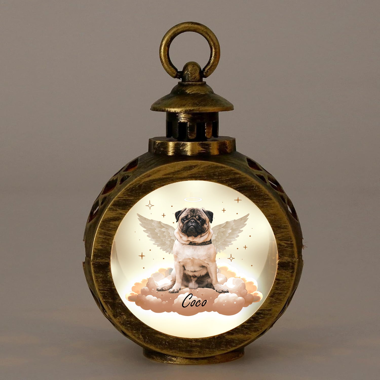This Personalized Memorial Lantern offers a heartfelt way to honor the memory of a loved one who has passed. It features a custom photo and personalized inscription, making it a meaningful tribute for those dealing with loss. The lantern has a classic vintage-inspired design with intricate details and a beautiful bronze finish, symbolizing the everlasting light that remains even after someone is gone.